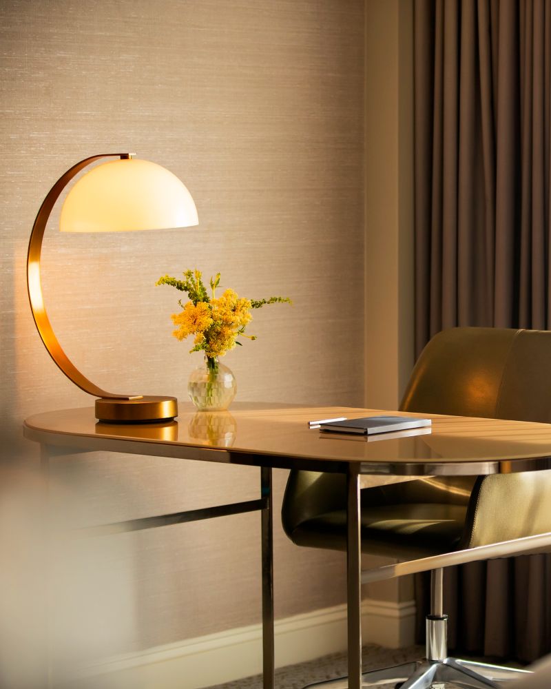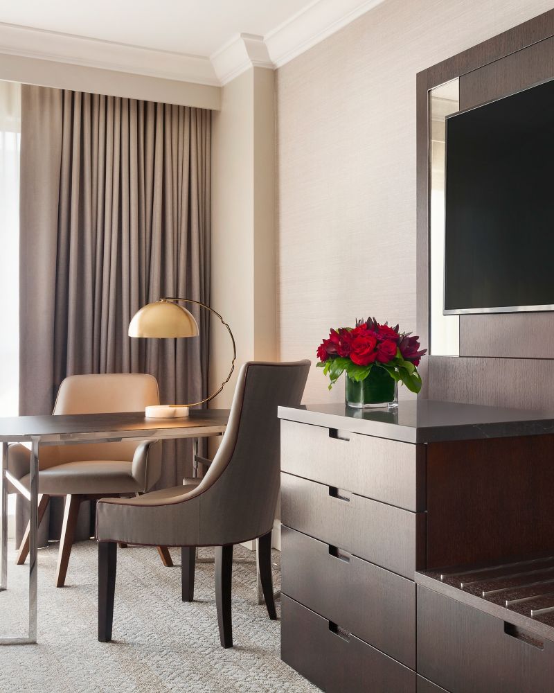 With dedicated dining and living spaces, the Ambassador Suite allows guests extra space for small gatherings and a private bedroom with one king bed. Great for business meetings or when traveling with family. Connecting Deluxe rooms are available.