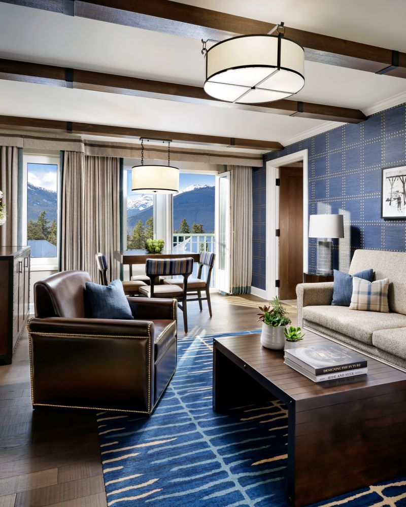 Boasting a expansive view of Rainbow Mountain, Enjoy this Spacious Suite, Large living room area with double sofabed and fireplace, 2 bathrooms, soaker tub, 2 TVs, Fully equipped work station, HSIA