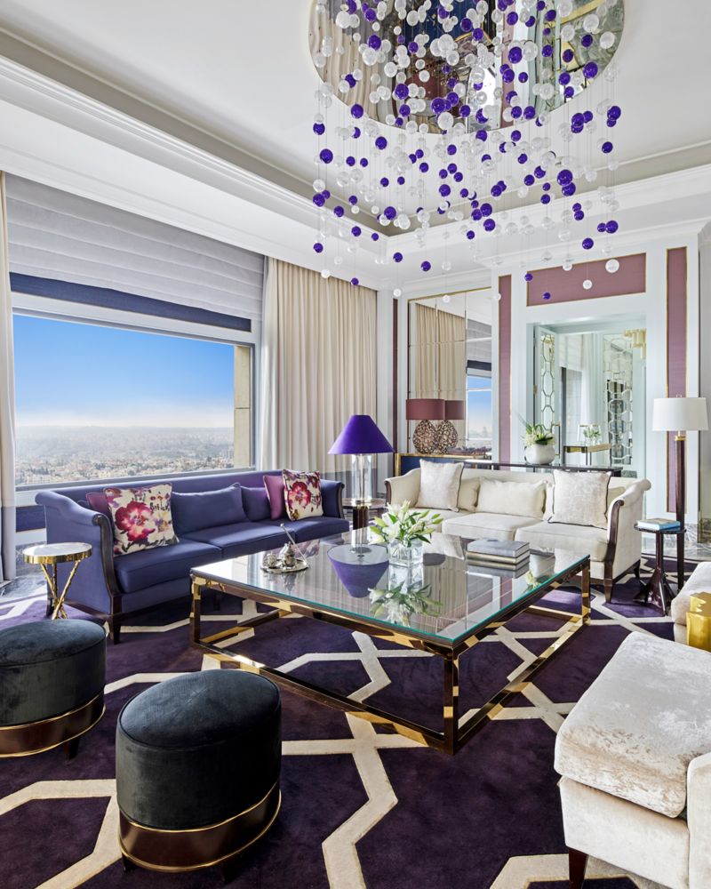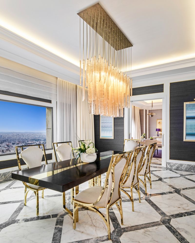 The Penthouse Suite offers a spacious and open floor plan, complete with 305 sqm of pure luxury. The lavish suite offers a master bedroom, a stunning dining room, premium features, hand-carved designs and a private terrace overlooking the panoramic Amman skyline.
