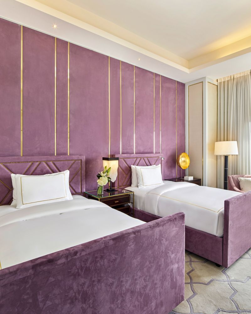 Habitación de 42 m² con dos camas queen size, espectaculares vistas, cafetera Nespresso, un lujoso baño, exclusivos productos de tocador Le Labo y acceso a Internet de alta velocidad.