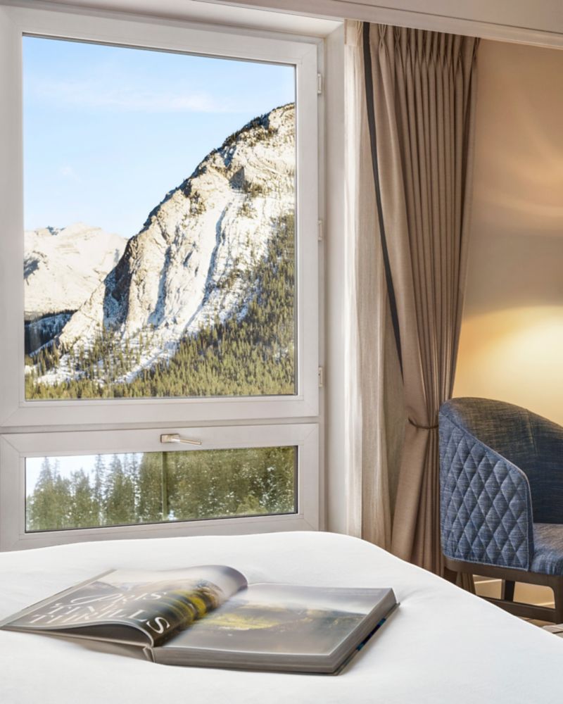 Disfrute de las impresionantes vistas de los majestuosos picos de las montañas, los verdes bosques y el sereno Bow River desde la ventana de su habitación.