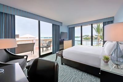 Situada en el ala Poinciana, con un balcón amplio con vistas al puerto. Baño, bañera y salón independiente con sofá cama, ideal para familias.