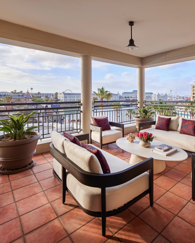 Tres habitaciones adjuntas, cocina separada, elegante comedor y balcón con vistas al puerto y a V&A Waterfront, ideales para socializar con comodidad y estilo.