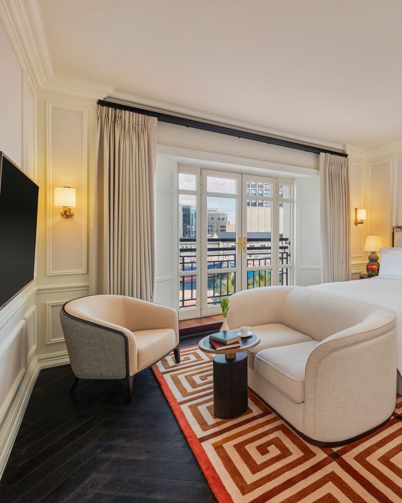 Exquisitely detailed suite with a balcony, separate lounge and dining area. It offers a sophisticated and memorable escape for solo travellers and couples alike.