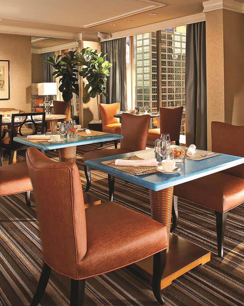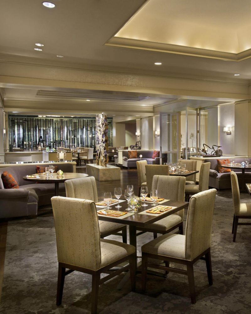 The Pyramid Restaurant resonates with a sleek, contemporary look that creates an imaginative and engaging space in the heart of Dallas’ downtown Arts District. The décor evokes a sophisticated glamour with a color palette in rich earth tones with accents of polished metal and dark mahogany flooring.