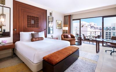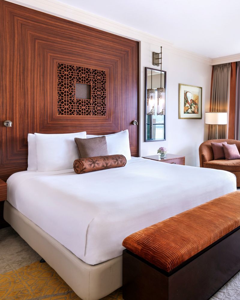 Esta amplia habitación Heritage de inspiración árabe es un oasis ideal y cuenta con colores relajantes, toques elegantes y balcón privado con vistas a las residencias de The Palm.