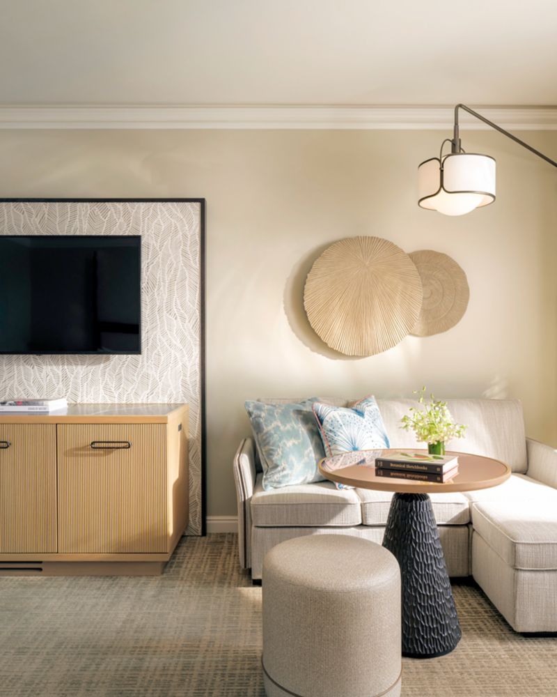 Amplia suite de estilo residencial con vistas al océano Pacífico desde un patio privado. Ofrece sala de estar separada del dormitorio por puertas francesas, mesa para el café de madera y mármol y escritorio. Incluye servicios Fairmont Gold.
