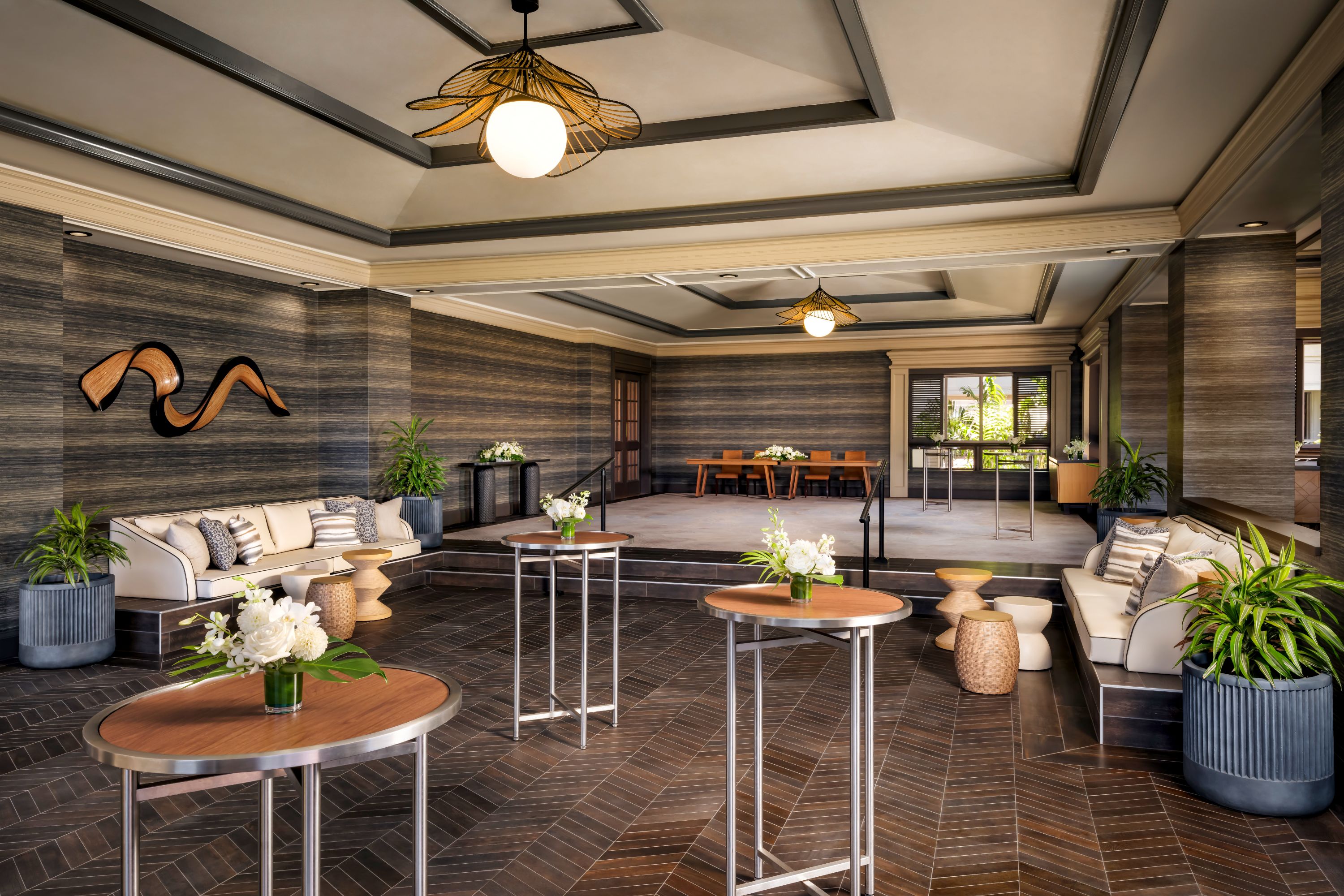 Located lobby level, this indoor/outdoor function space is the ideal location for your reception at Fairmont Orchid, Hawaii. Enjoy sweeping sunset views from the private lanai with cocktails before moving inside to your reception dinner.