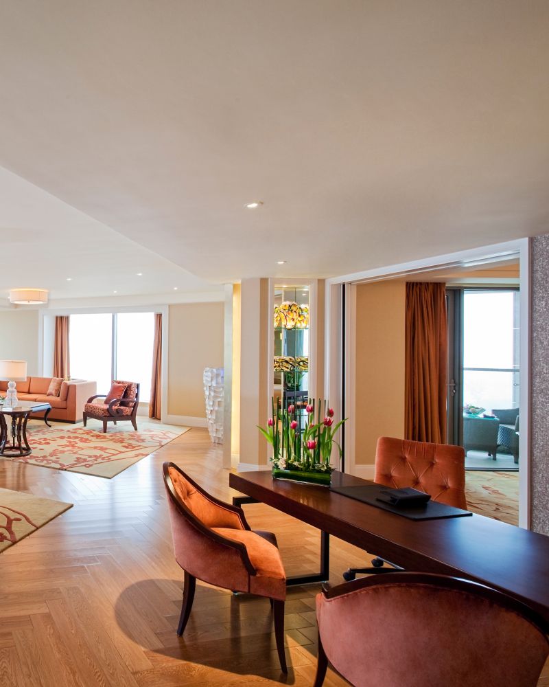 The Suites offer separate living rooms and bedrooms in a residential design, with wooden floors in the living room. A main feature of the One-bedroom suites is their huge marble bathrooms, which all come with large bathtubs and separate showers.