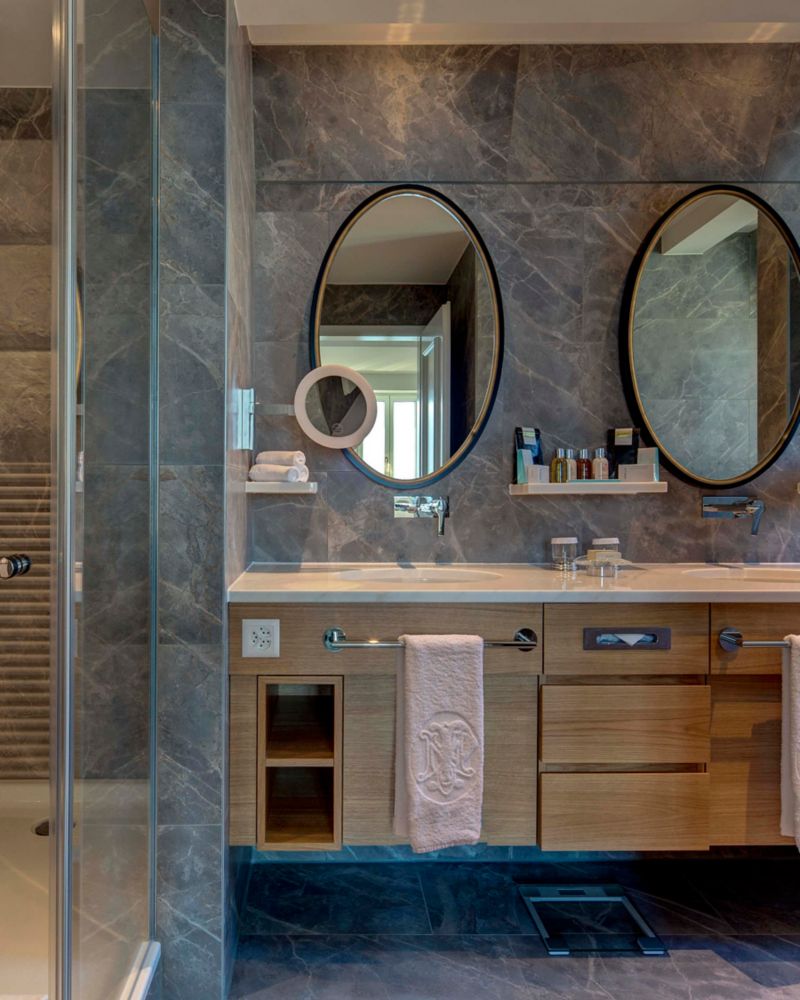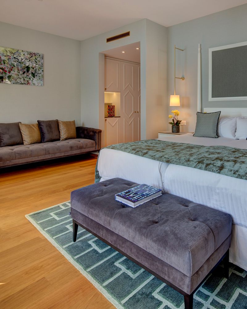 The Bellevue suites feature spacious bedroom with oversized bed, modern furniture, in-suite iPad directory and adjacent bathroom entirely marbled.