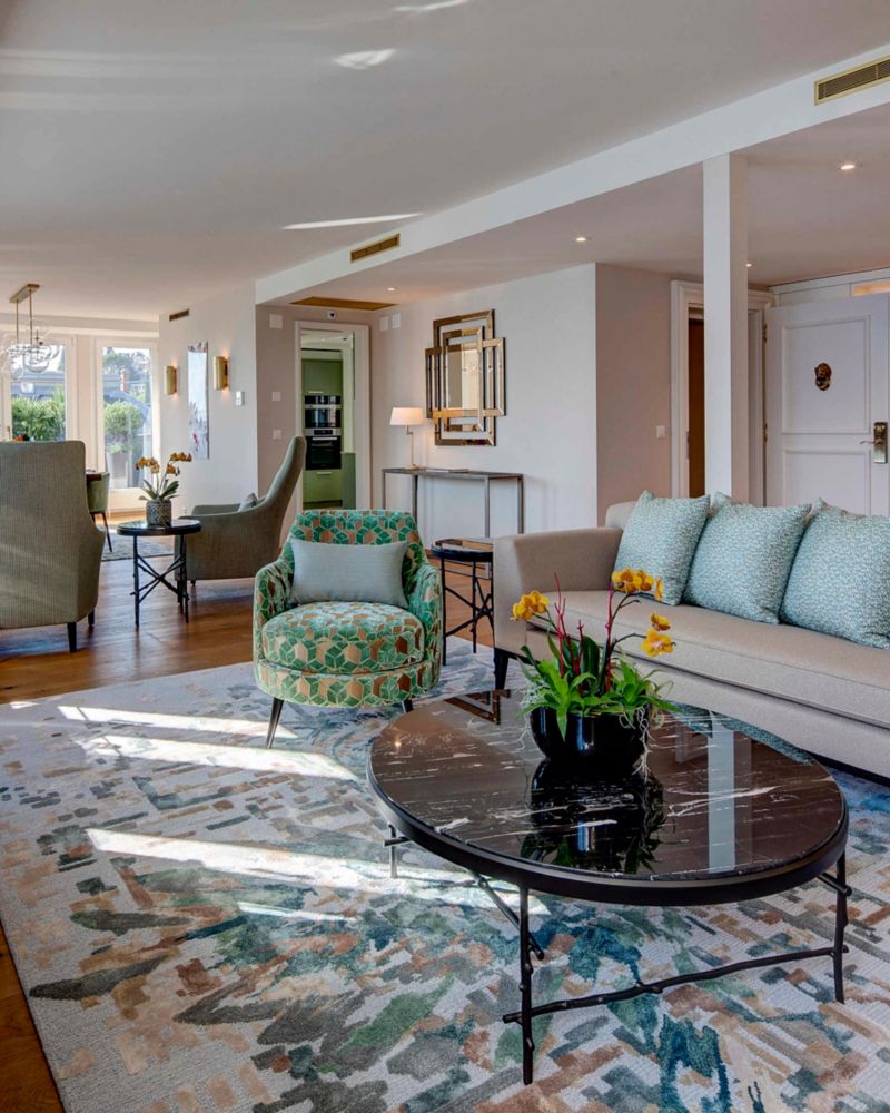 The Junior Lake View Suite is a luxurious open-concept room with an elegant design, where you can admire the amazing view on Lake Geneva and the Alps from the large balcony, offering a King or Twin bed, a sofa bed, and luxury amenities.