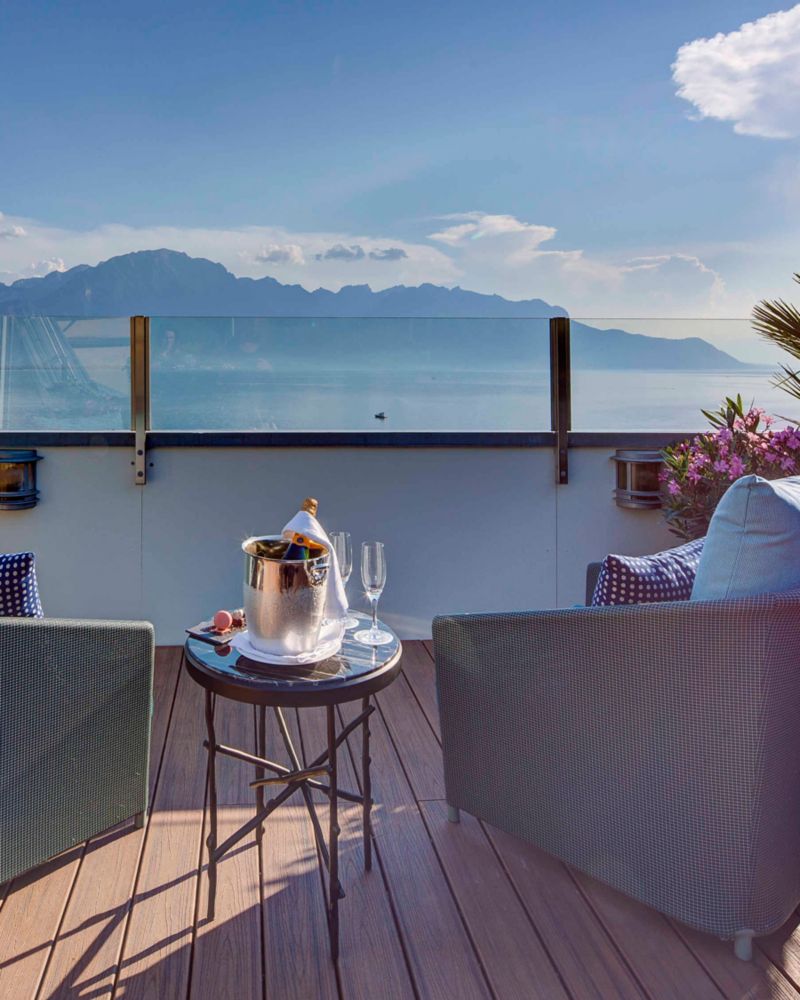 Our Penthouse Suite offers unrivaled luxury with a private elevator, a 360° terrace showcasing the best views of Lake Geneva and the Alps, and an expansive living space for ultimate comfort.