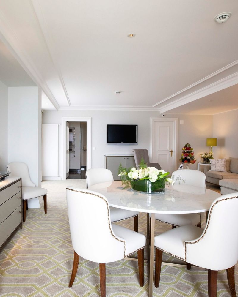 Traditional suite with separate living room in a luxurious decor. Features a spacious marble bathroom, a large terrace overlooking Lake Leman and the Alps, and in-suite iPad directory.