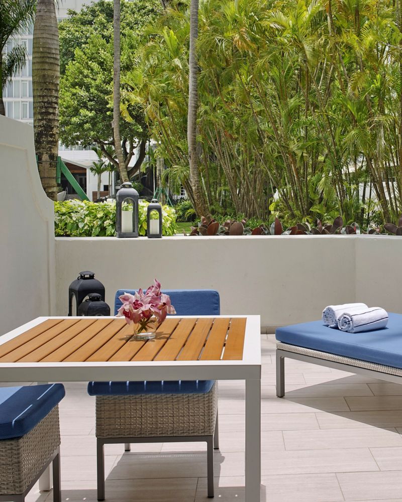 Esta habitación, ubicada a unos pasos de nuestros jardines y la exclusiva piscina Well & Being, es el paraíso perfecto para descansar la mente y el cuerpo en la terraza durante una estancia inolvidable.