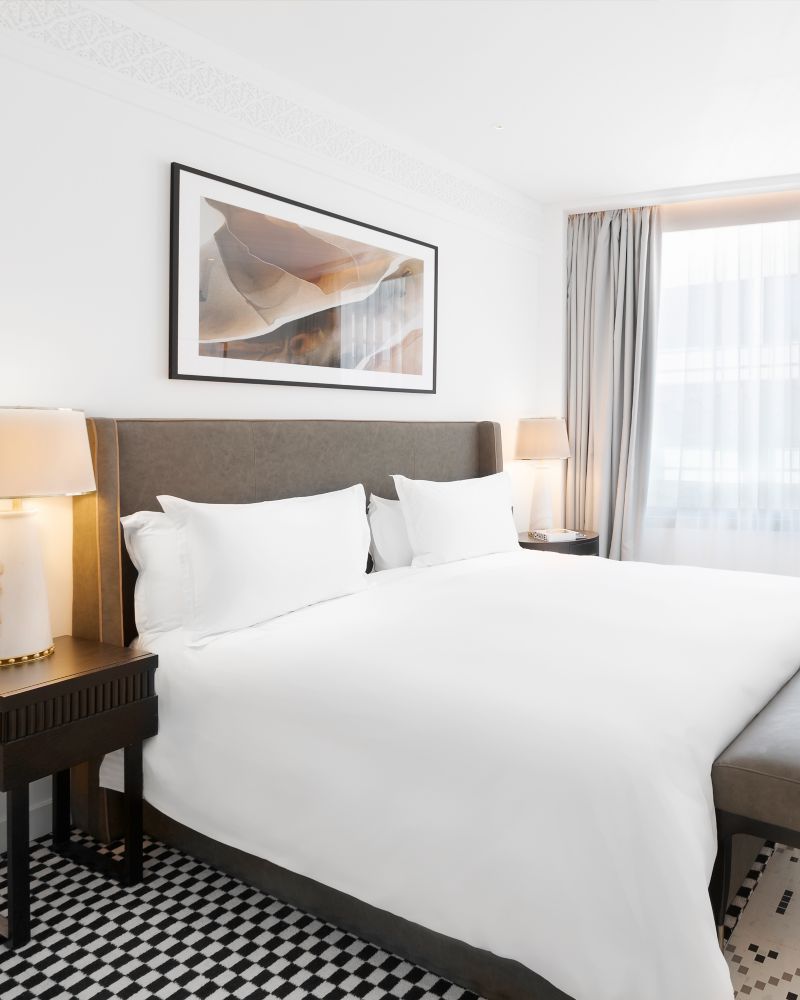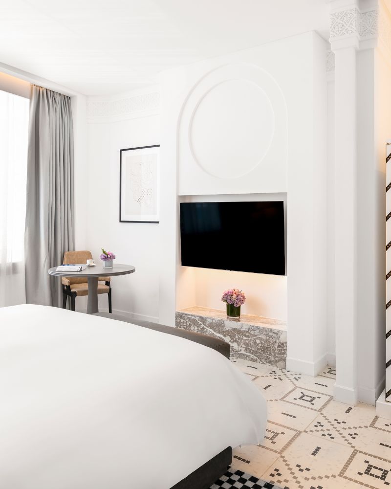 La habitación Fairmont se caracteriza por la influencia marroquí y cuenta con ventanales, un opulento baño equipado con productos de tocador de lujo y un espacio de trabajo que mezcla sutiles detalles históricos con elementos modernos de artistas locales