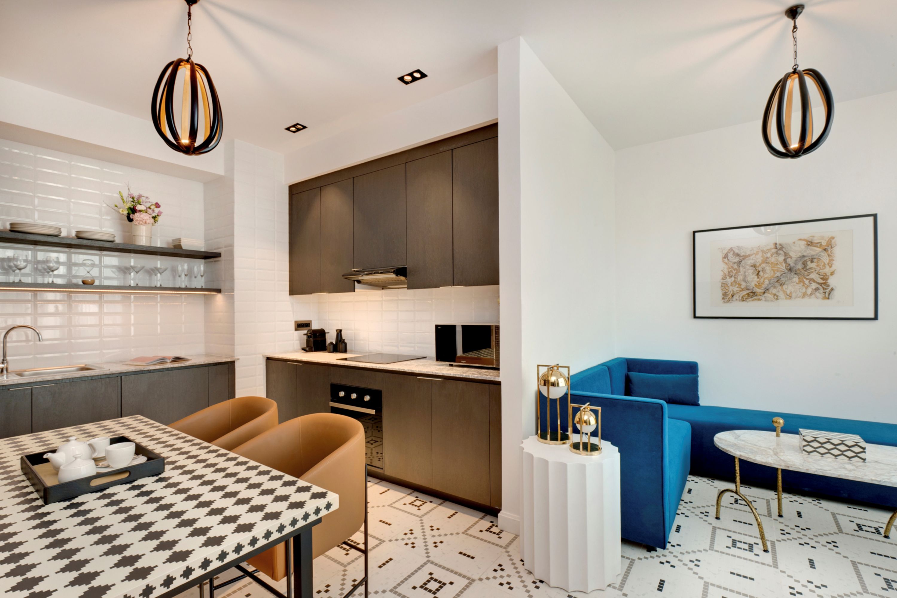 Un dormitorio elegante con cama king size, sala de estar con luz natural y cocina lista para un chef. Tome un café en la terraza con iluminación inteligente, ropa de cama lujosa y productos de baño de primera calidad para una estancia Fairmont mejorada.