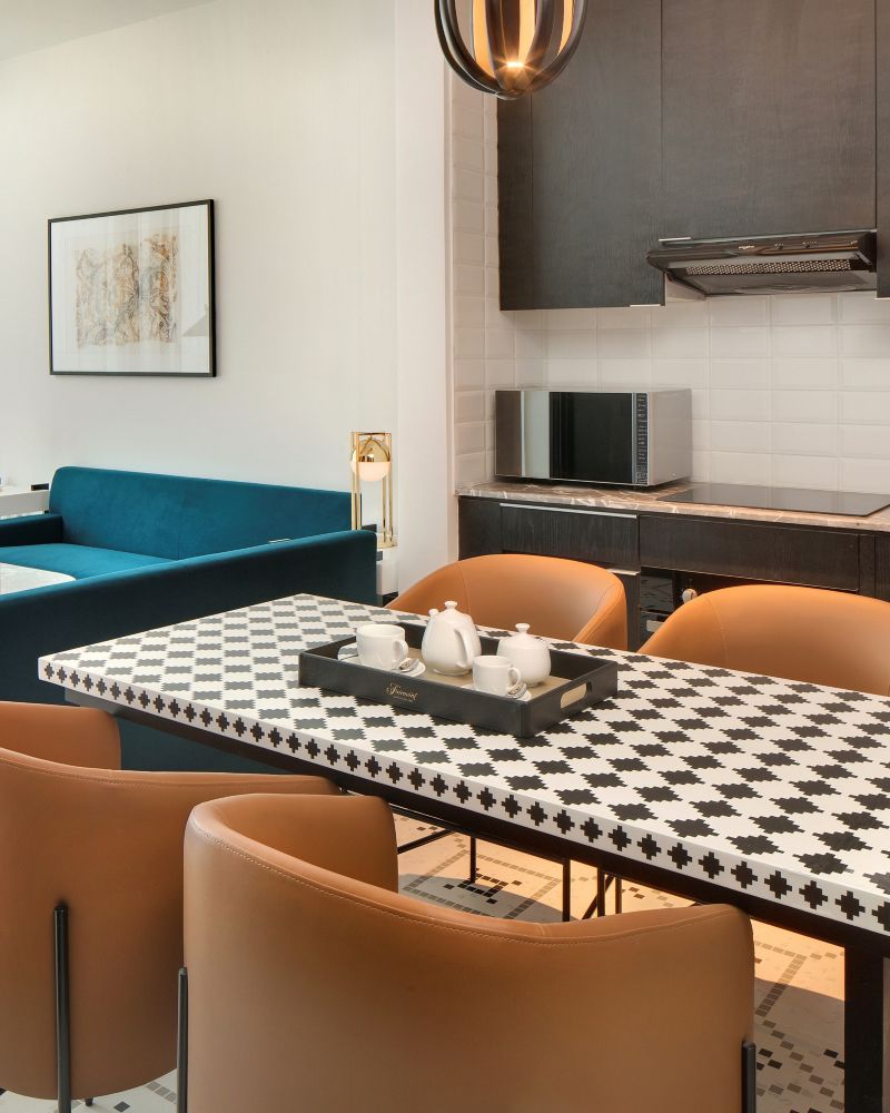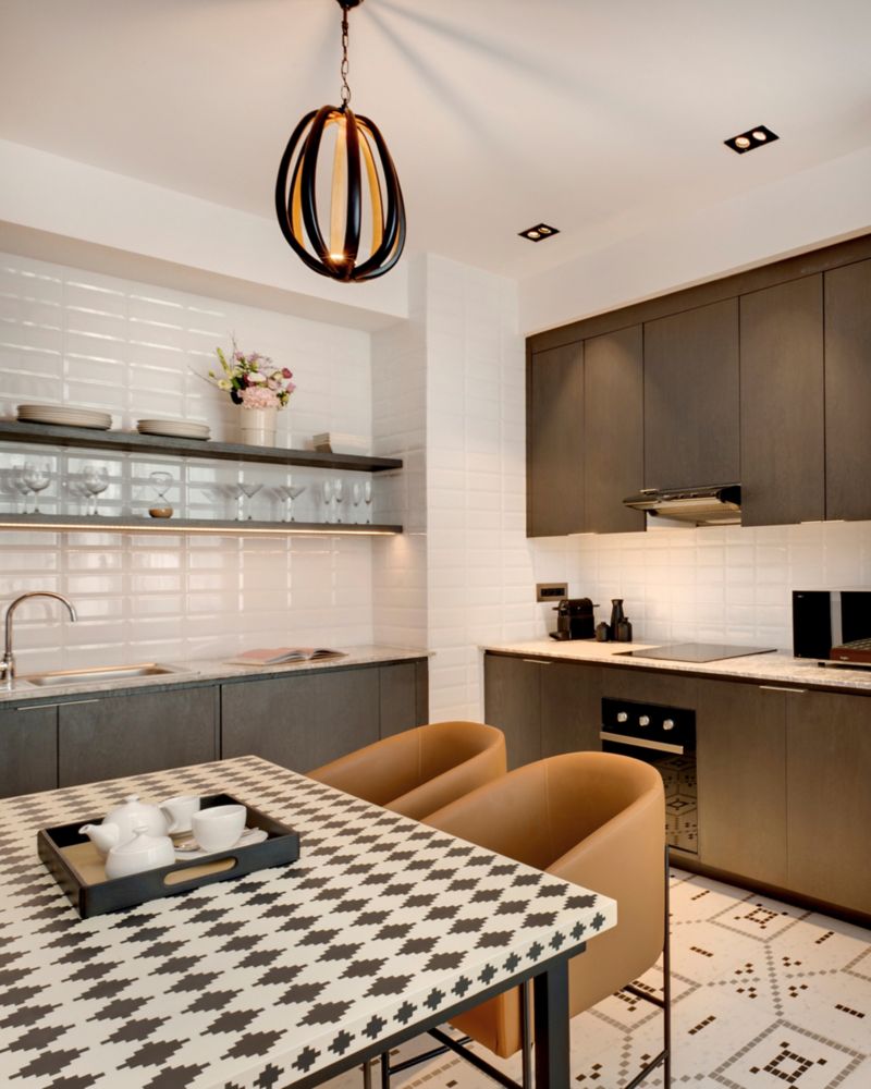Un elegante santuario urbano con una lujosa cama tamaño king, una sala de estar iluminada por el sol y una cocina elegante. Las características de una casa inteligente, los artículos de baño de primer nivel y los detalles exclusivos garantizan comodidad con los inconfundibles servicios de Fairmont.