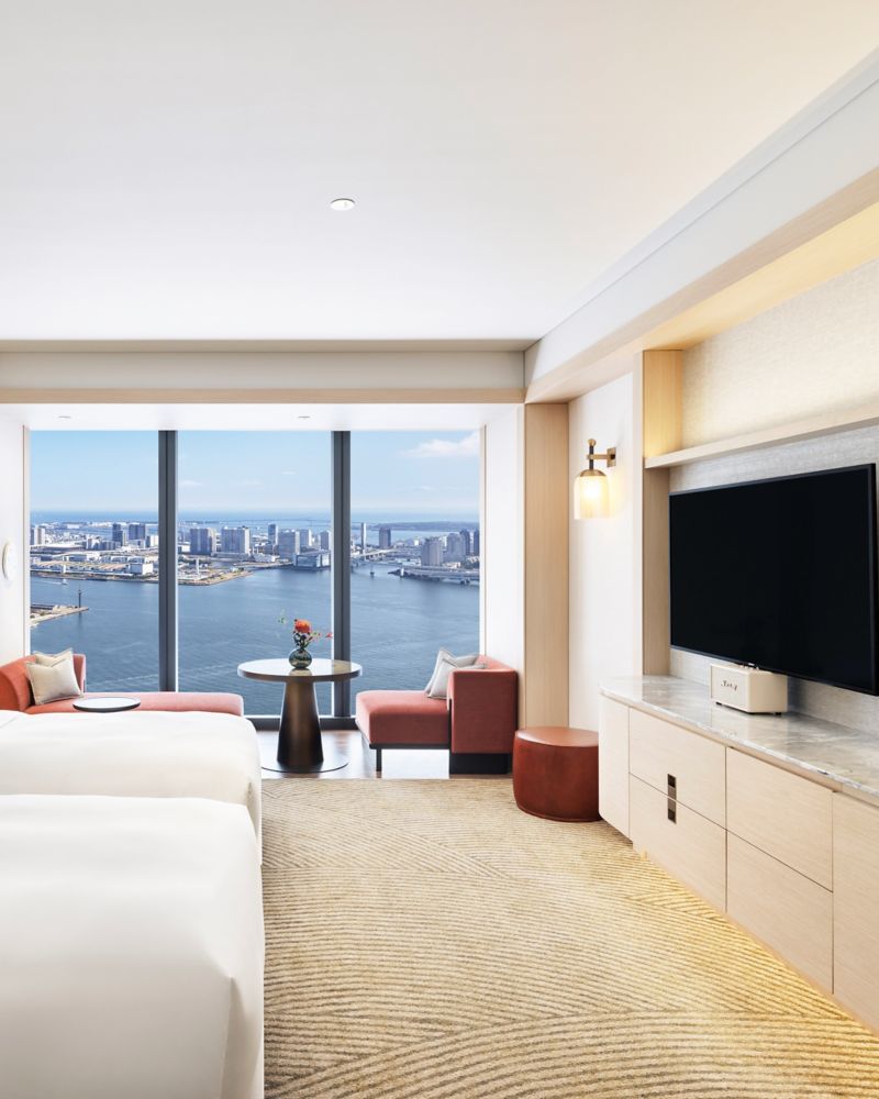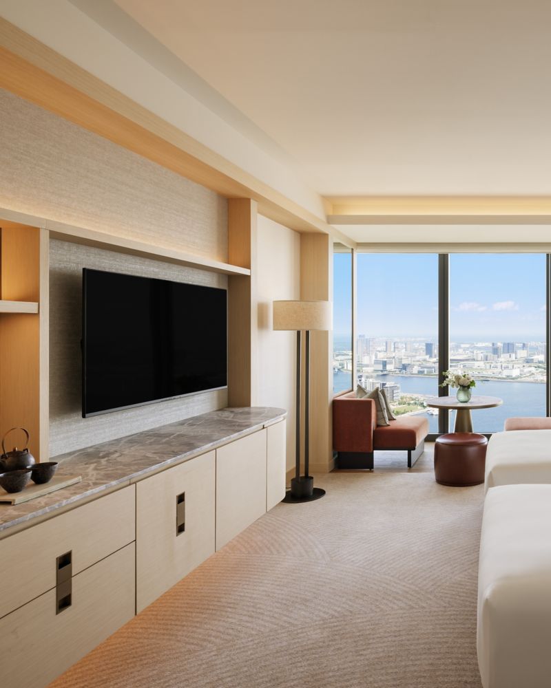 Awaken to the breathtaking vistas of Tokyo Bay. Immerse yourself in unparalleled tranquility within our expansive 52 sqm sanctuary, offering versatile interiors and a charming window-side seating area inspired by the traditional Japanese Engawa. Refresh in a serene bathroom designed for ultimate relaxation.