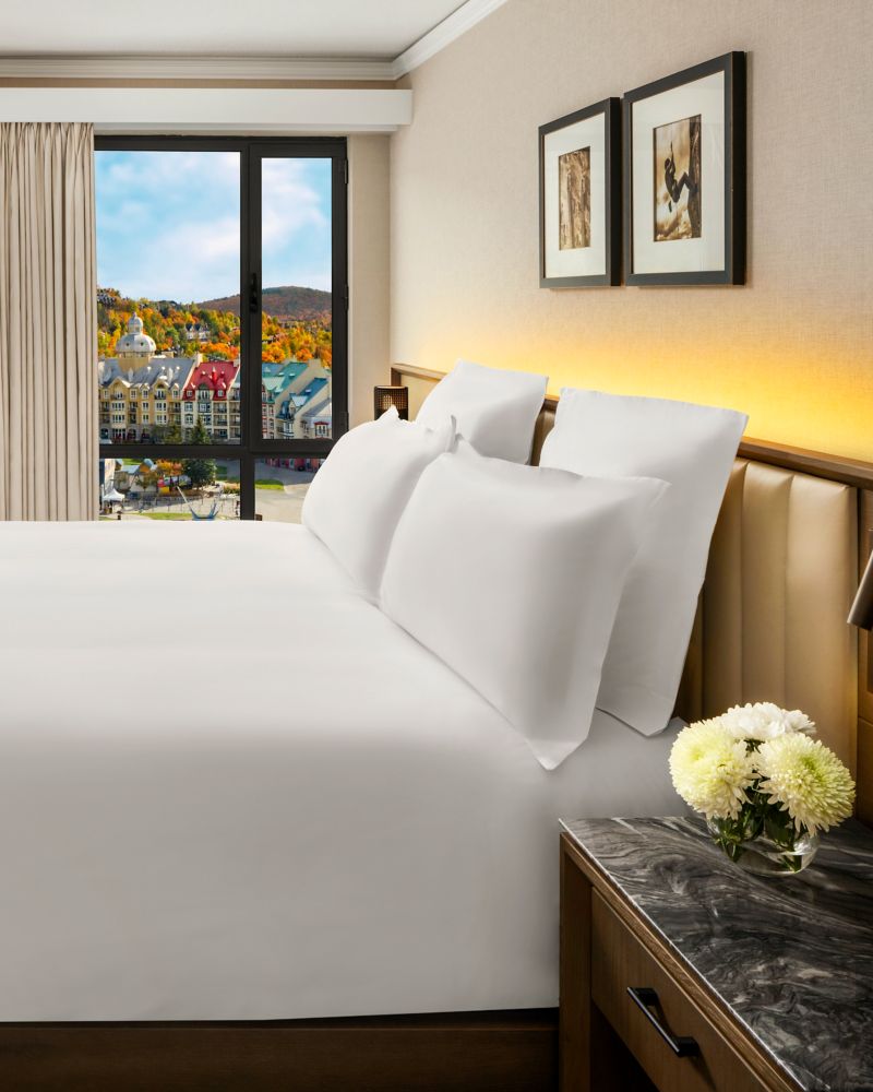 Habitación recientemente reformada, ubicada en planta alta y con vistas al pueblo de Tremblant, servicio personalizado, acceso al salón Fairmont Gold, registro de llegada y salida privado y opciones de habitaciones comunicadas