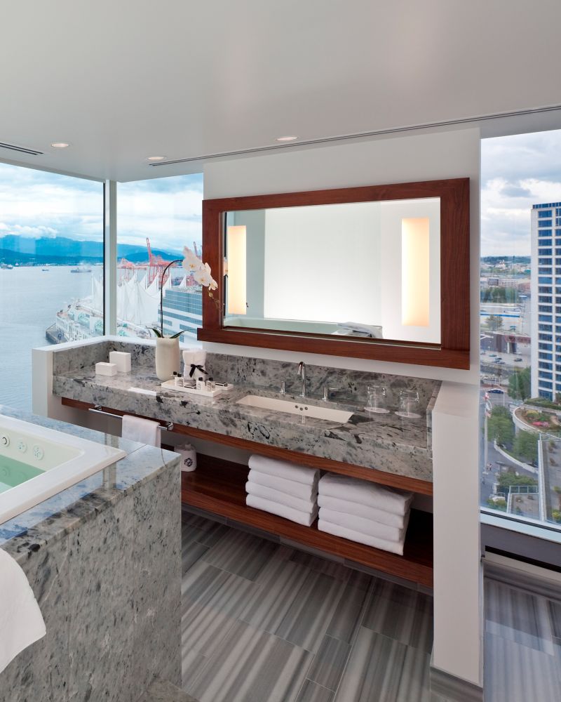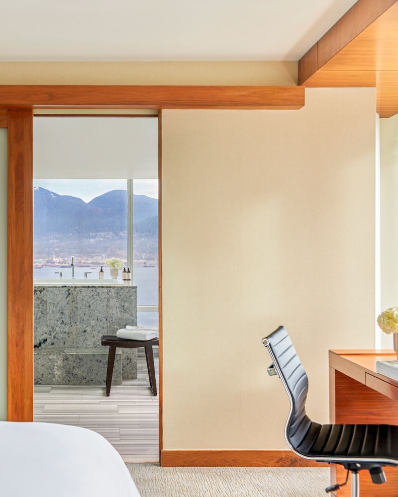 Las mejores vistas de Vancouver se pueden disfrutar desde la comodidad de nuestras lujosas habitaciones Signature Ofuro. Estas habitaciones con cama King que cuentan con un baño de mármol tipo spa de gran tamaño y bañera profunda de hidromasajes japonesa Ofuro están elegantemente diseñadas con una decoración contemporánea refinada con una vista espectacular a Coal Harbour y las montañas de North Shore.