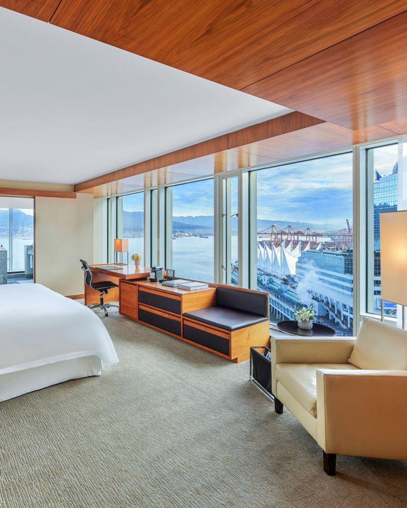 La recién renovada suite Fairmont Gold, en las plantas 21 o 22, ofrece vistas a Stanley Park y Coal Harbour. Toques residenciales, patio, lámpara Bocci, sofá B and B Italia, TV de 75", aseo de estilo japonés, ducha de spa y bañera de hidromasaje.