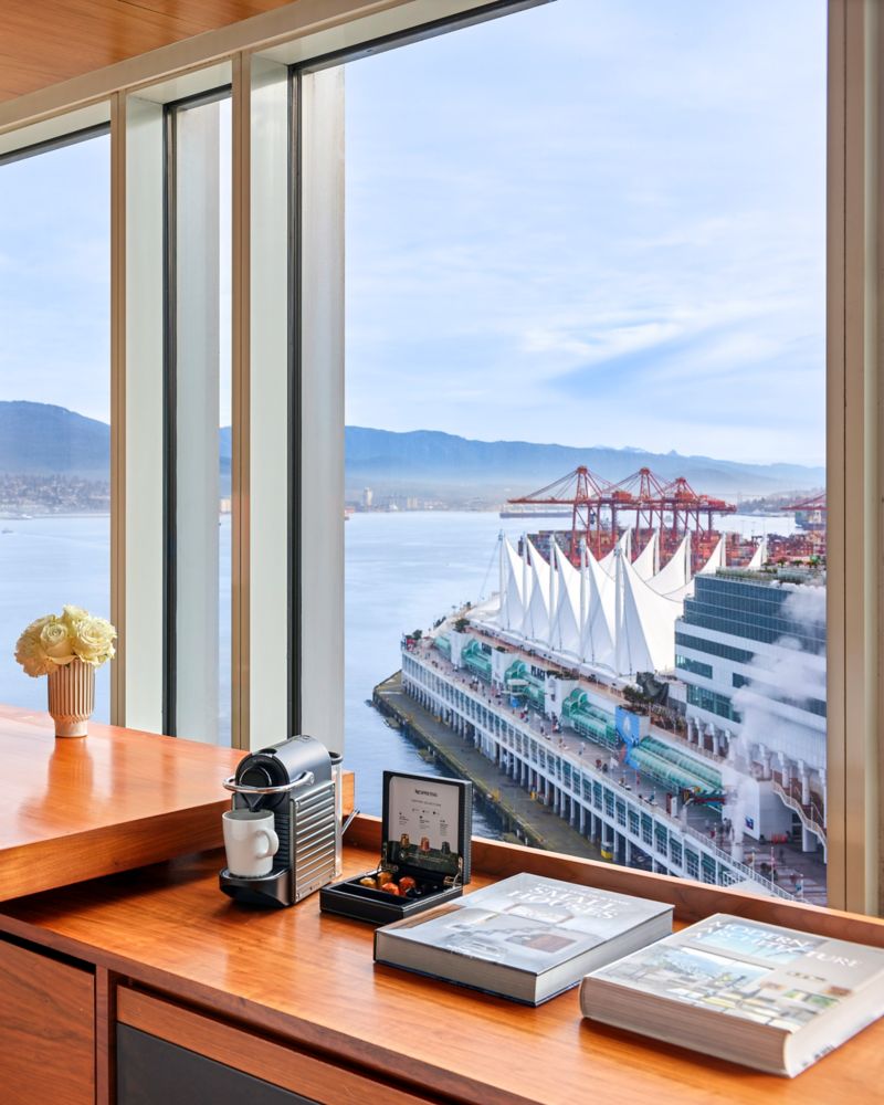 La suite Signature ofrece las vistas más impresionantes de Vancouver al puerto y la montaña. Elementos de moda, arte y música se incorporan al salón, dos baños de mármol, dormitorio con una cama king size y amplio vestidor.