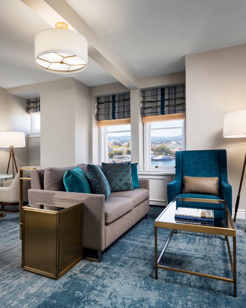 Habitación de planta abierta con una amplia cama king size, zona de estar elegante y vistas al Inner Harbour de Victoria. Perfecta para ocasiones especiales.