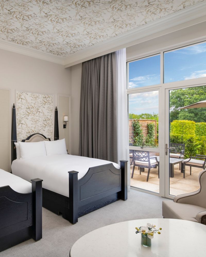 Dos camas dobles, balcón, impresionante baño con ducha a ras de suelo y bañera independientes, cafetera y tetera, smart TV de 55", tocador y albornoces de lujo