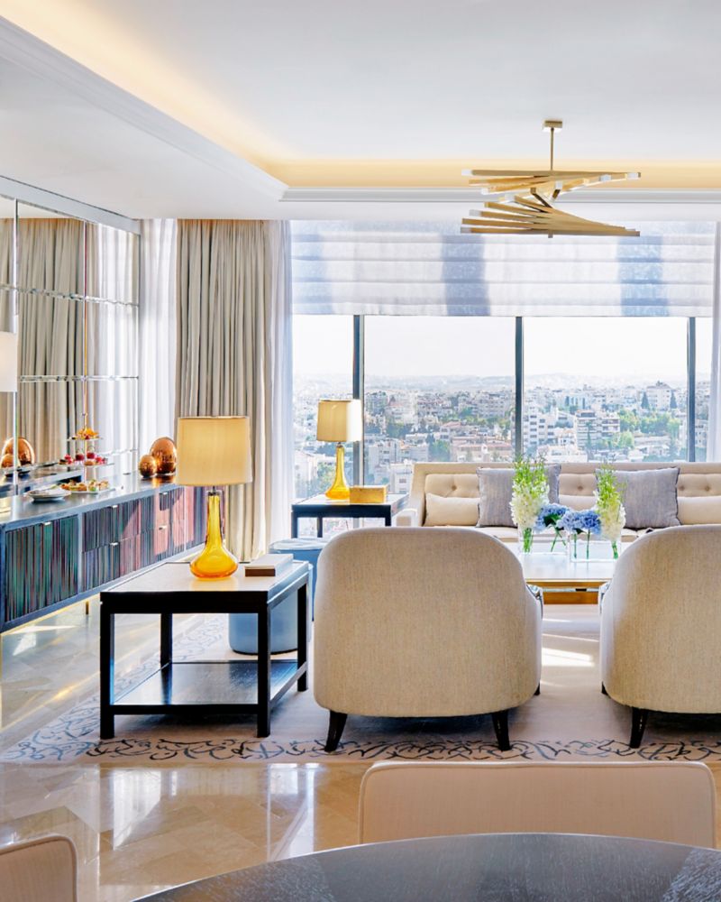Suite royale Amman luxueuse avec lit King size et vue panoramique sur la ville, salon et salle à manger séparés, espace de travail privé, accès exclusif au salon Fairmont Gold et accès gratuit aux installations du spa.