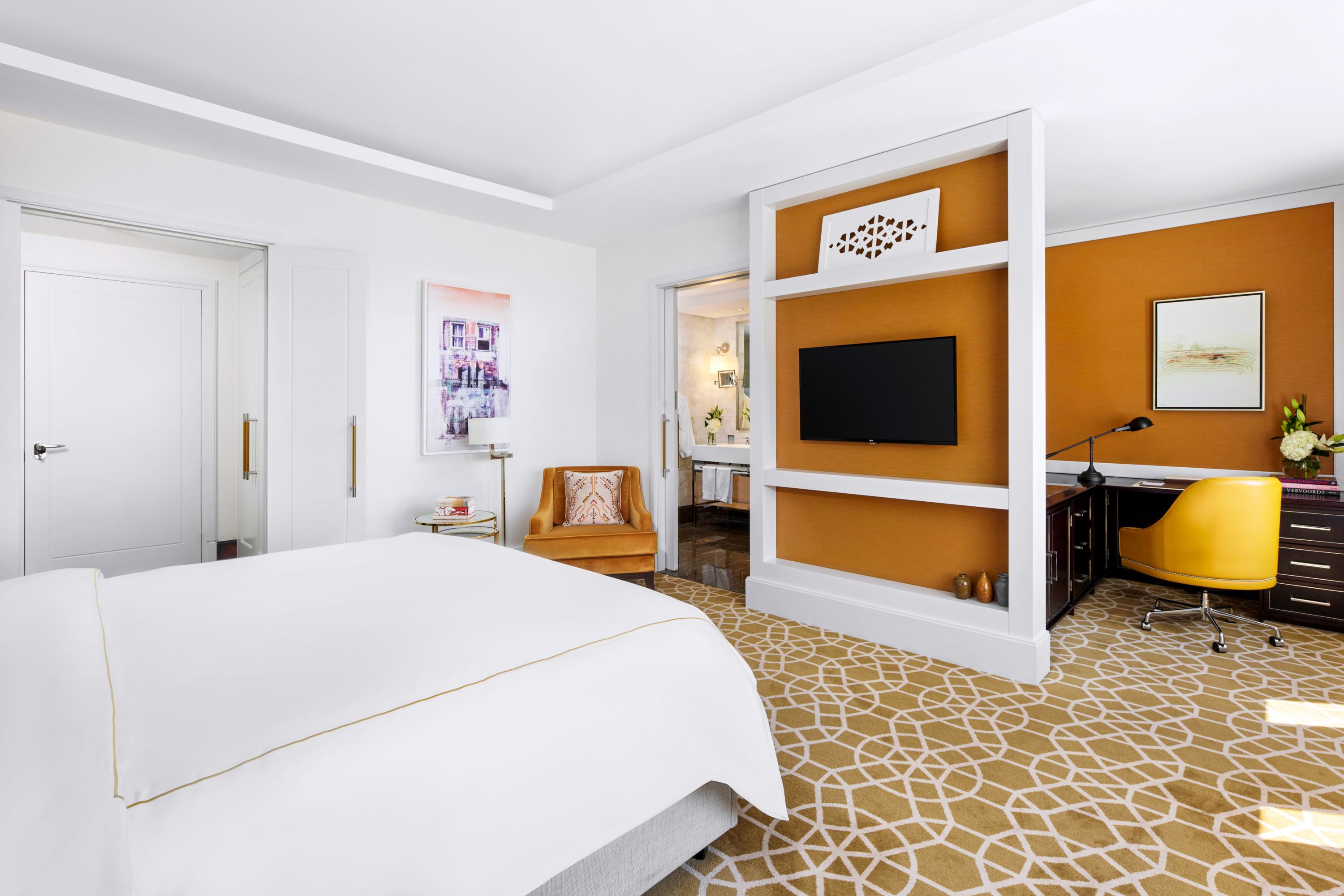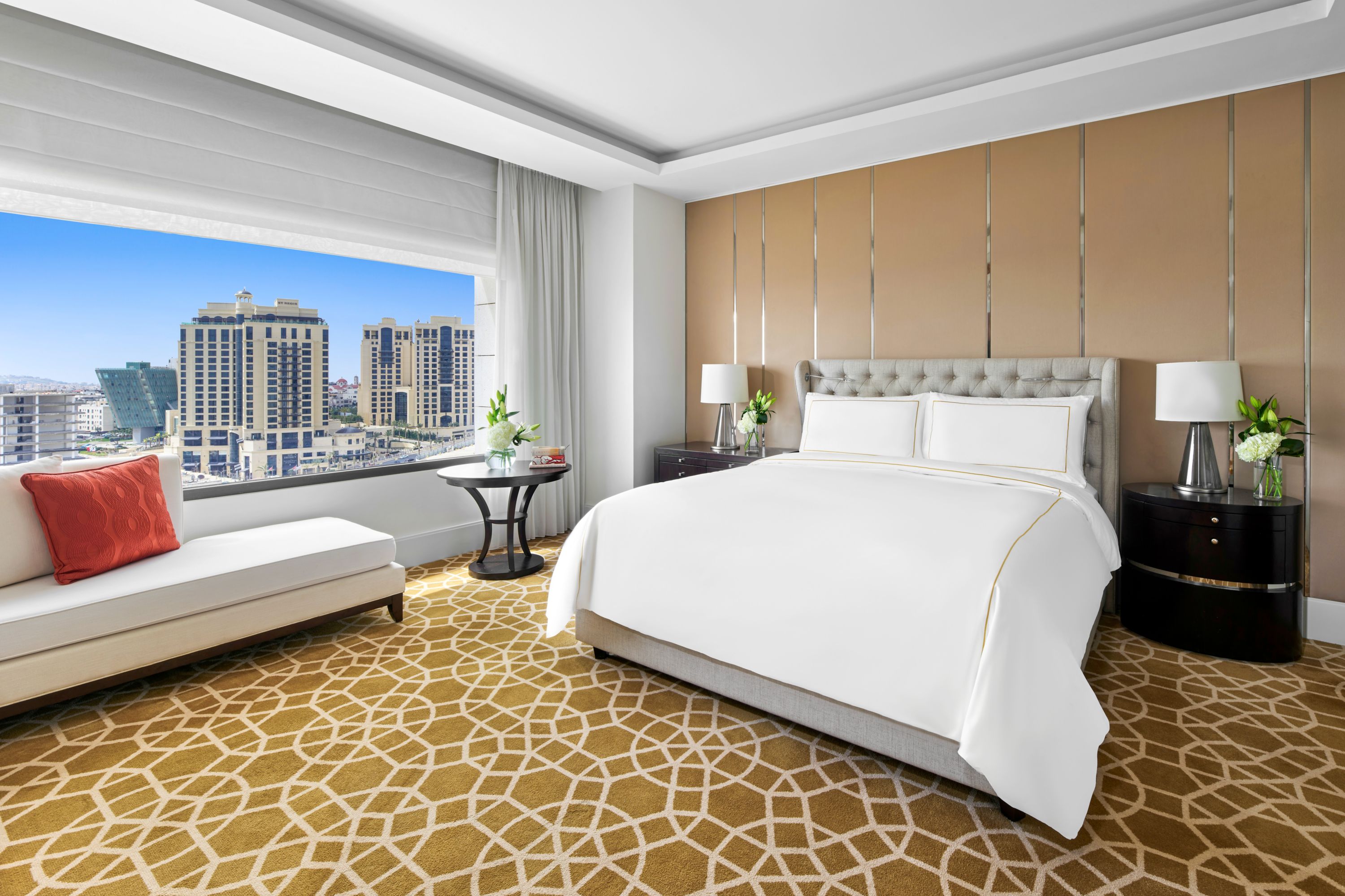 Royal Amman Suite with king bed and panoramic city skyline views, featuring a luxurious living room, dining area, private workspace, and exclusive Fairmont Gold Lounge access, along with complimentary access to the spa’s facilities.