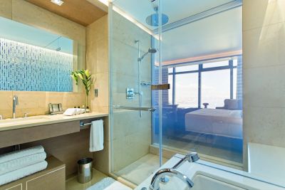 Stunning 50sqm/538sqft room with accessible amenities: No bathtub,handrails in shower,emergency button by the toilet and emergency indicator in bedroom. Room is in harmony with Panoramic Baku City view.