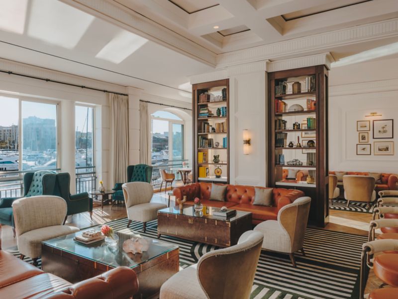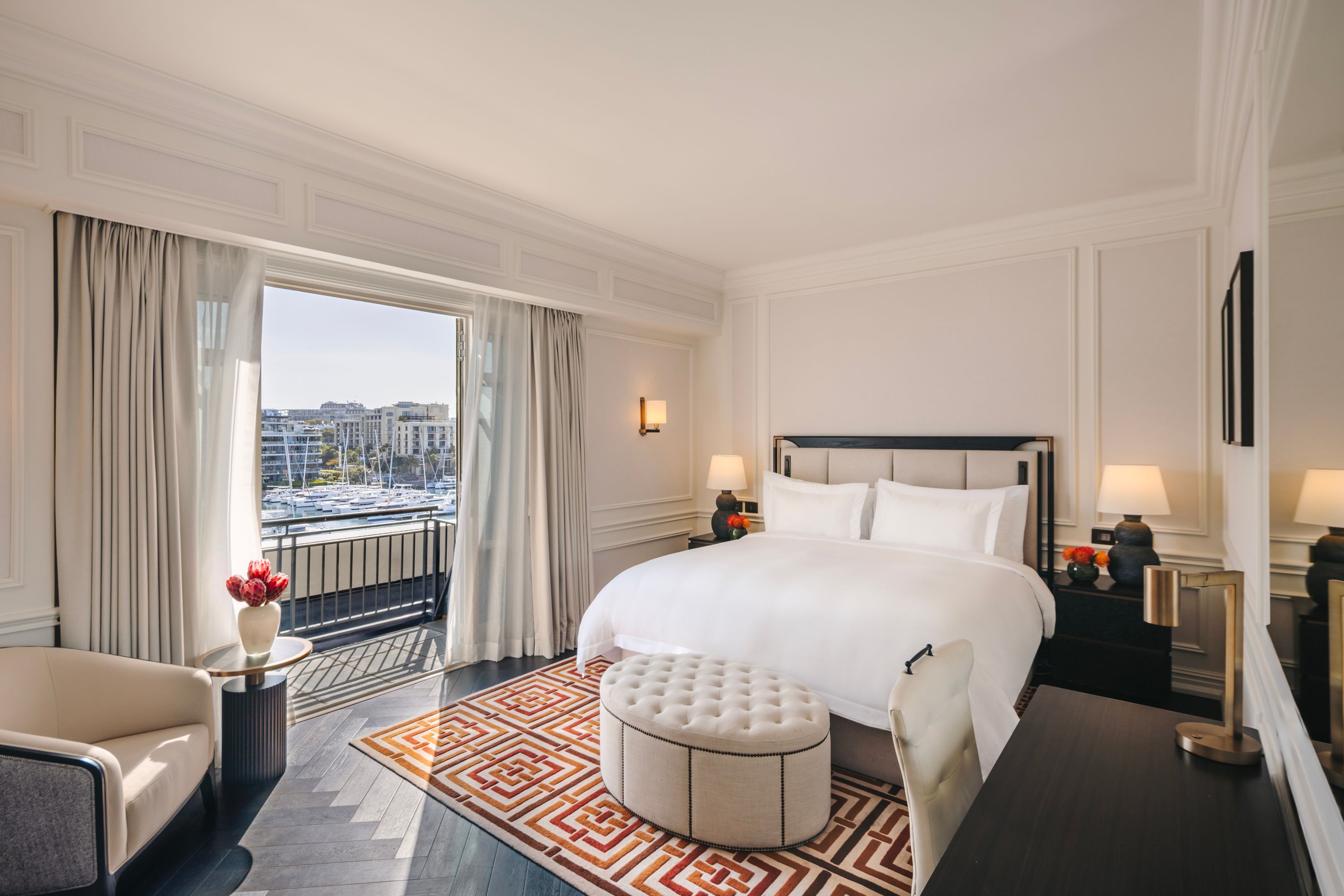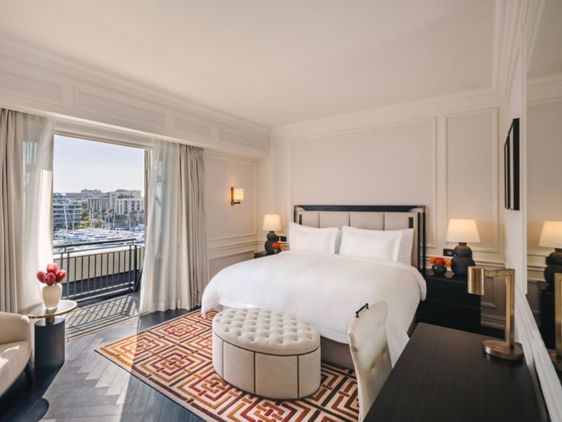 La chambre de 45 m² avec vue sur le port commercial offre un mobilier élégant, un décor contemporain intemporel et du linge de lit luxueux. Portes-fenêtres, dressing et salle de bain marbre attenante. Chambres communicantes et lits jumeaux sur demande.