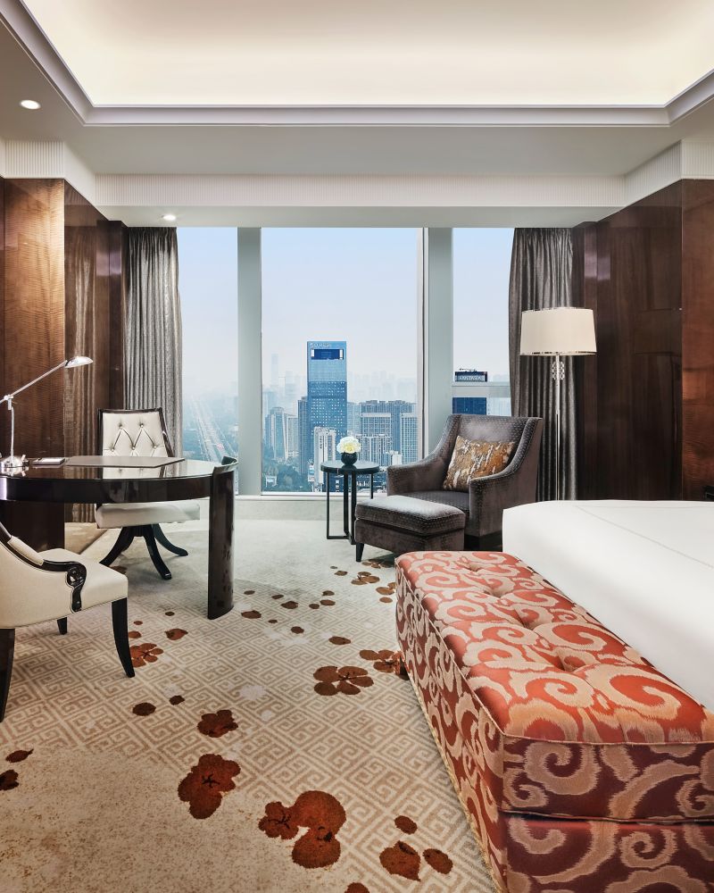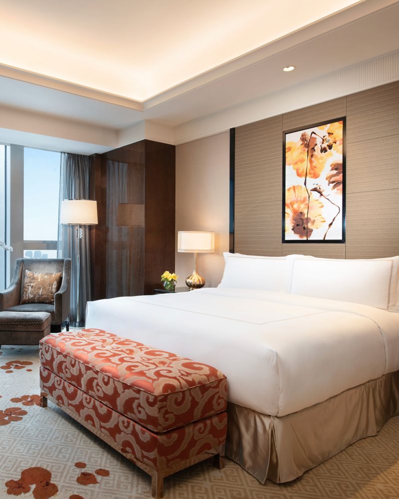 Room with a king bed. Located on 6th to 27th floors and boasting an expansive space of 45-50m², the room showcases an amazing city view of Hi-tech Zone adjacent to the large Convention & Exhibition Centre, bustling shopping malls and commercial district.