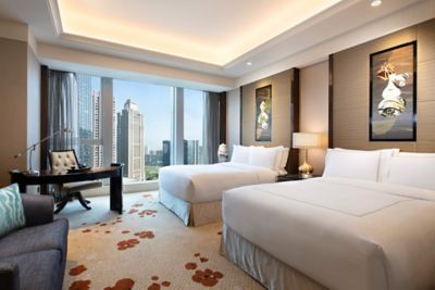 Cette spacieuse chambre de 45 à 50 m² dispose de 2 lits Queen size et est située aux étages supérieurs (du 19ᵉ au 26ᵉ). Dotée de baies vitrées du sol au plafond, elle offre une vue panoramique sur les centres commerciaux animés et le quartier d'affaires.