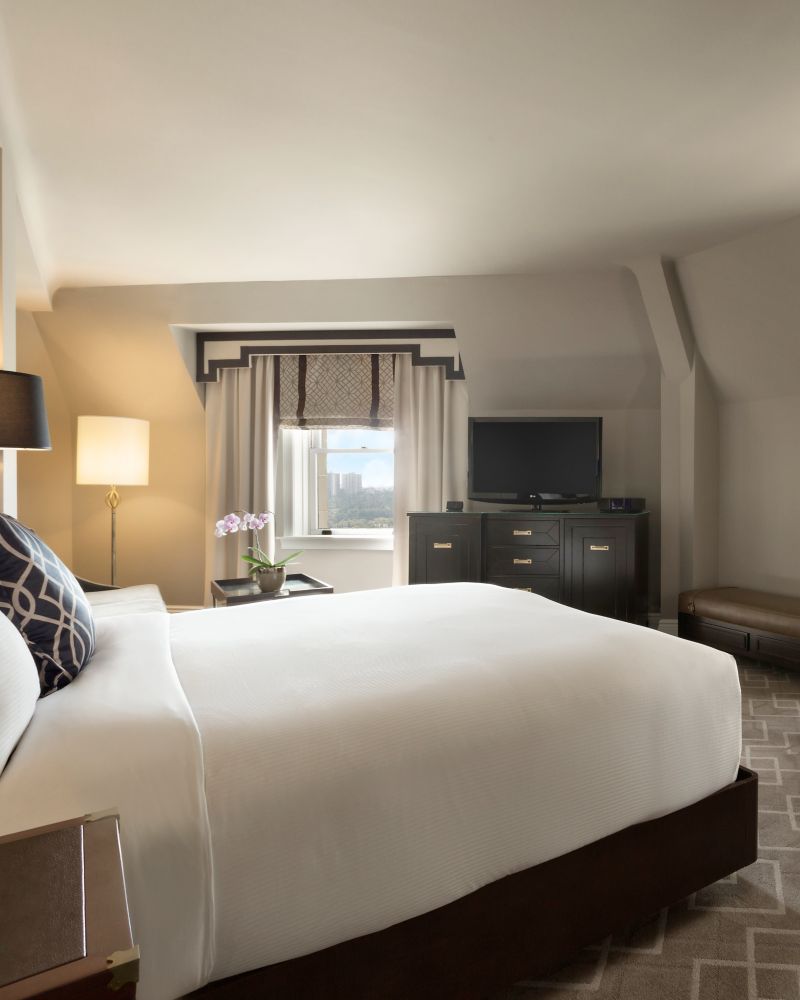 Espace et lumière. Très grand lit, portes-fenêtres menant au salon, vue sur la vallée de la rivière, 8e étage, douche spa moderne, accès exclusif au salon Fairmont Or, articles de bain Le Labo, système iHome, 42 m²