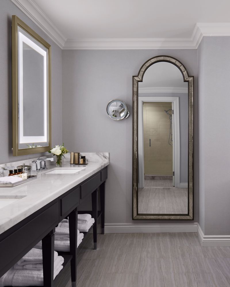 Beautifully renovated guest room with small sitting area with multi-use table. Guests will enjoy a lavish 3-piece bathroom with illuminated mirrors.