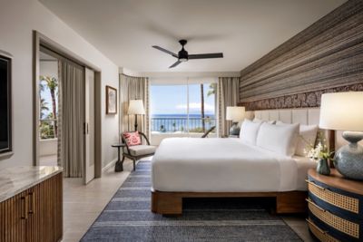 Bénéficiez d'un point de vue dégagé sur l'océan depuis la grande terrasse meublée. Suite avec une chambre et décoration évoquant le patrimoine culturel de Maui. Salle de bain luxueuse avec baignoire, douche à l'italienne et meuble double vasque.