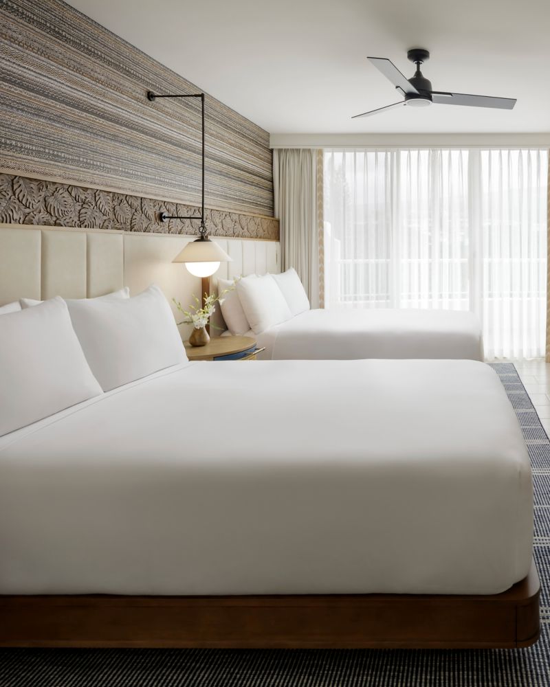 Suite spacieuse avec une chambre, des collections d'art et de design d'inspiration hawaïenne, une terrasse avec du mobilier extérieur et un accès à la piscine. Salle de bain luxueuse avec baignoire, douche à l'italienne et meuble double vasque.