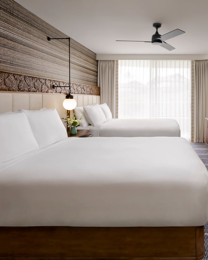 Suite spacieuse avec une chambre, des collections d'art et de design d'inspiration hawaïenne, une terrasse avec du mobilier extérieur et un accès à la piscine. Salle de bain luxueuse avec baignoire, douche à l'italienne et meuble double vasque.