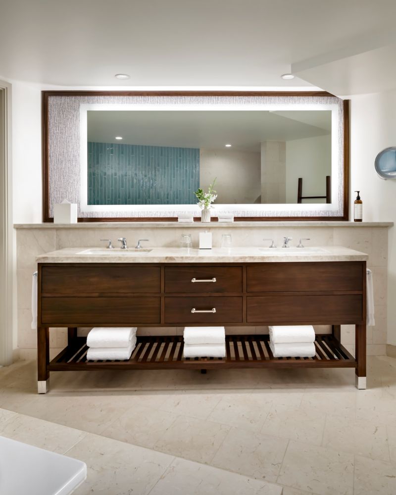 Suite spacieuse avec une chambre, art et design d'inspiration hawaïenne, terrasse avec vue sur Haleakala. Baignoire PMR à barres d'appui, porte de 80 cm, toilettes à barres d'appui latérales et arrière, douche à l'italienne et meuble double vasque.