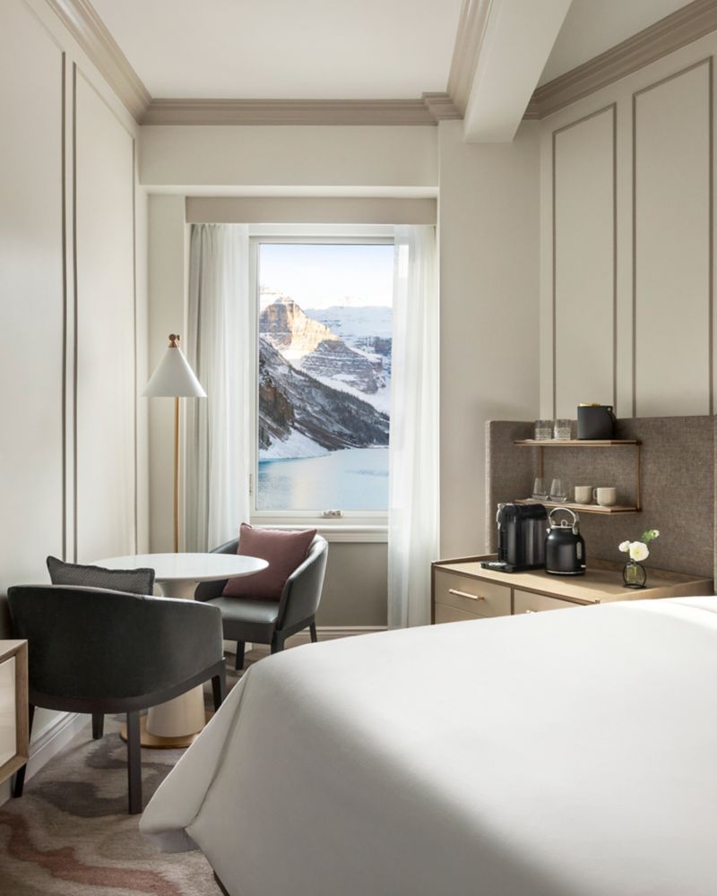 Grande chambre avec lit 1 lit King offrant une vue imprenable sur le lac Louise et le glacier Victoria. Hébergement idéal pour une personne seule ou un couple. 34 m².