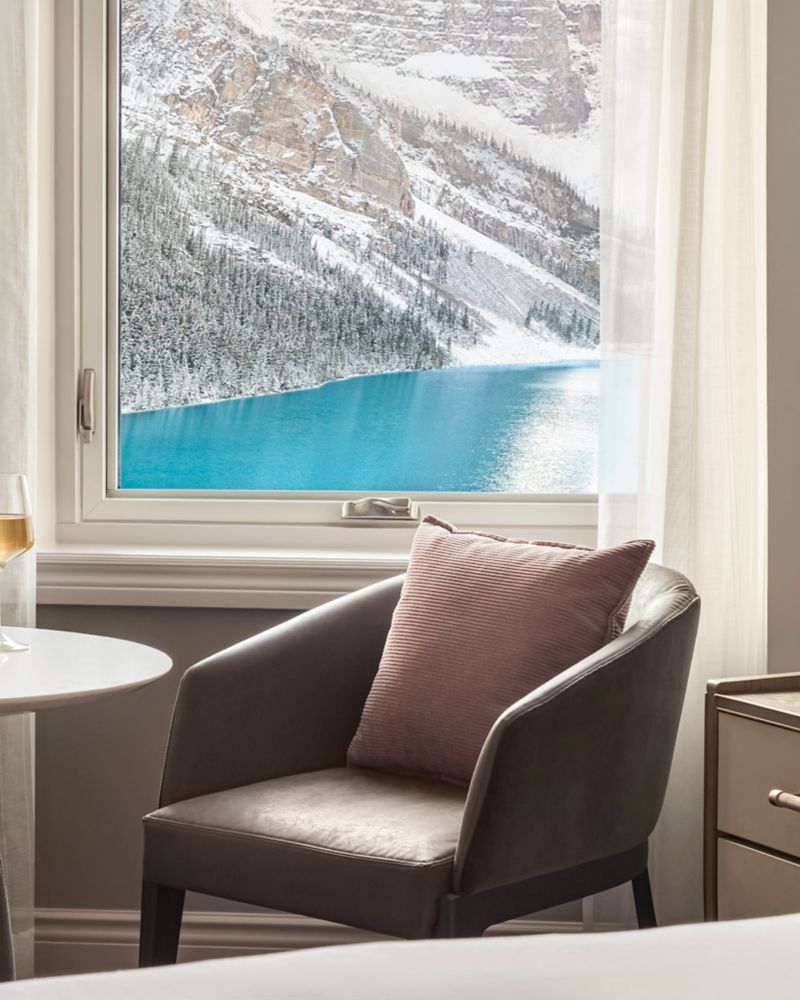 Chambre équipée d’un lit Queen size offrant une vue spectaculaire sur le lac Louise et le glacier Victoria. Chambre de 21 m² idéale pour un couple ou une personne seule.