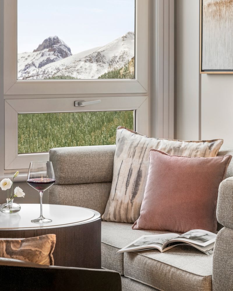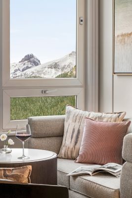 Salon privé avec services conciergerie proposant petit déjeuner et canapés. Open Concept avec lit 1 King. Vue sur le mont Whitehorn ou la vallée Bow. 44 m².