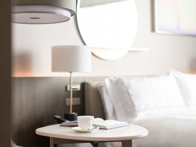Élégante suite au 9e étage avec une vue imprenable sur la ville grâce aux grandes baies vitrées donnant sur 2 balcons privés. Accessible PMR et malentendants avec alarmes visuelles et appareils d'alerte. Interrupteurs et penderie à 1,20 m de hauteur max.