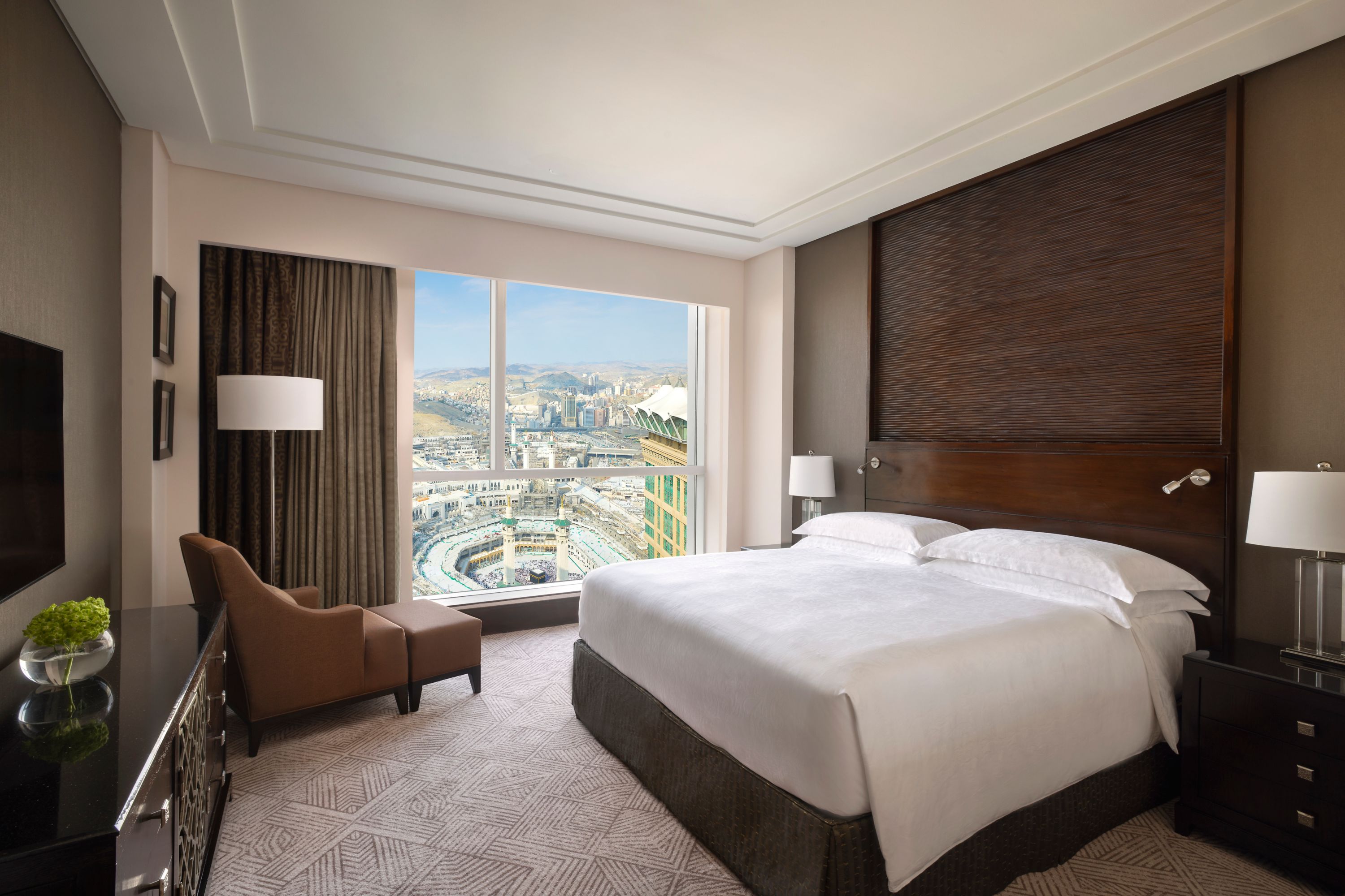 Profitez de 172 m² de luxe Fairmont Gold avec entrée privée, ascenseurs dédiés, majordome, accès Gold Lounge exclusif, salle de prière privée, privilèges Health Club et restauration au restaurant offrant la meilleure vue sur le Haram.