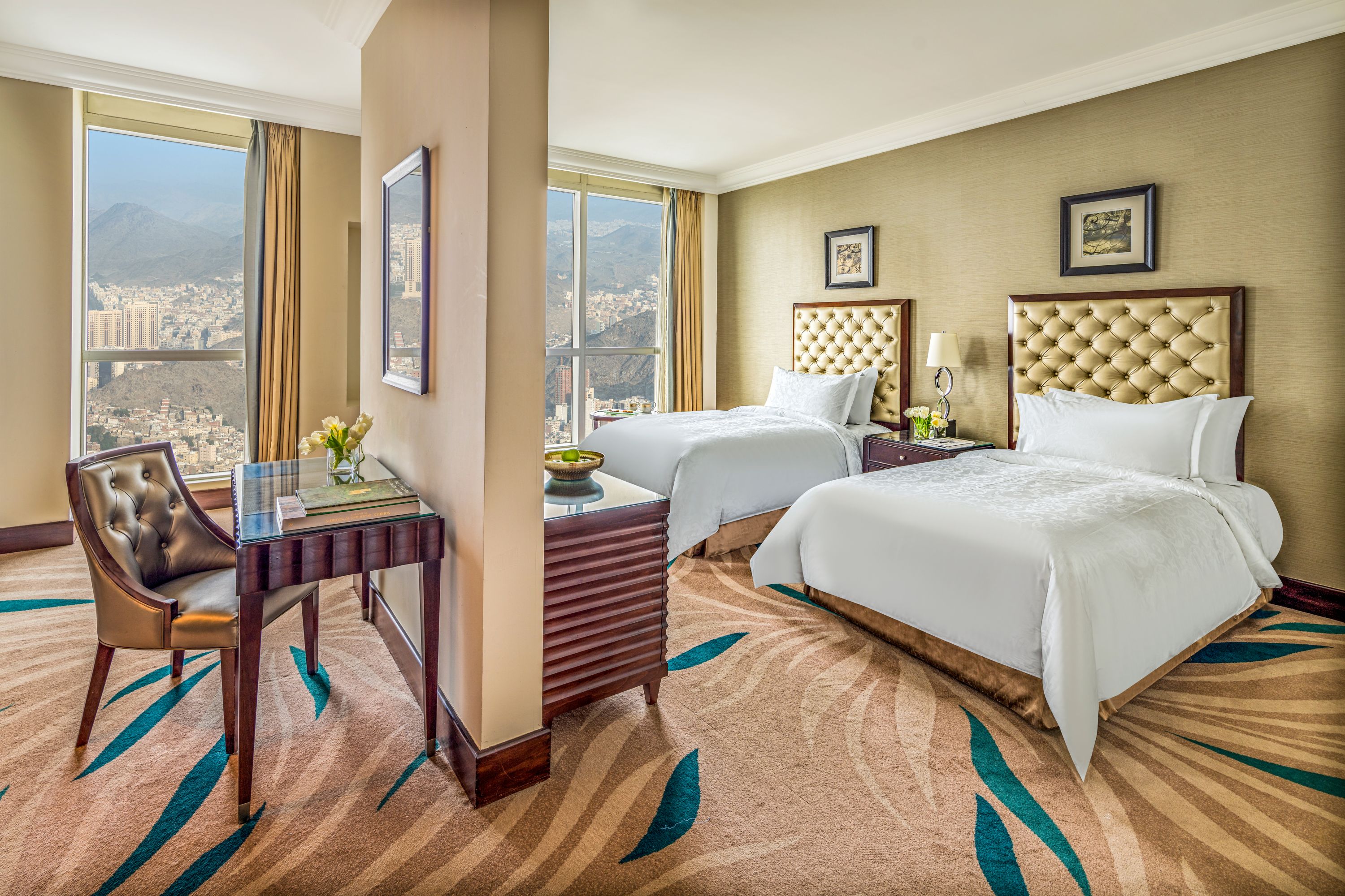 Profitez de 42 m² de confort Fairmont Gold avec lits jumeaux, salle de bain, TV LCD 32", centre de rafraîchissements avec café et thé, audio Haram en chambre et cadre raffiné non-fumeur avec vue paisible sur le Haram et service personnalisé.