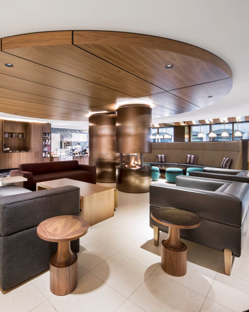 La cheminée et les boiseries du Kréma en font un lieu paisible dans lequel se retirer dans le hall.
