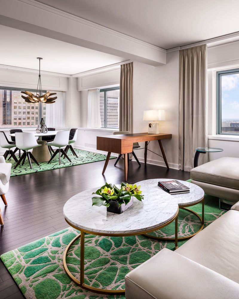 La seule suite à deux chambres de l’établissement Fairmont Le Reine Elizabeth offre une vue spectaculaire sur Montréal, y compris sur l'imposante cathédrale Marie-Reine-du-Monde.