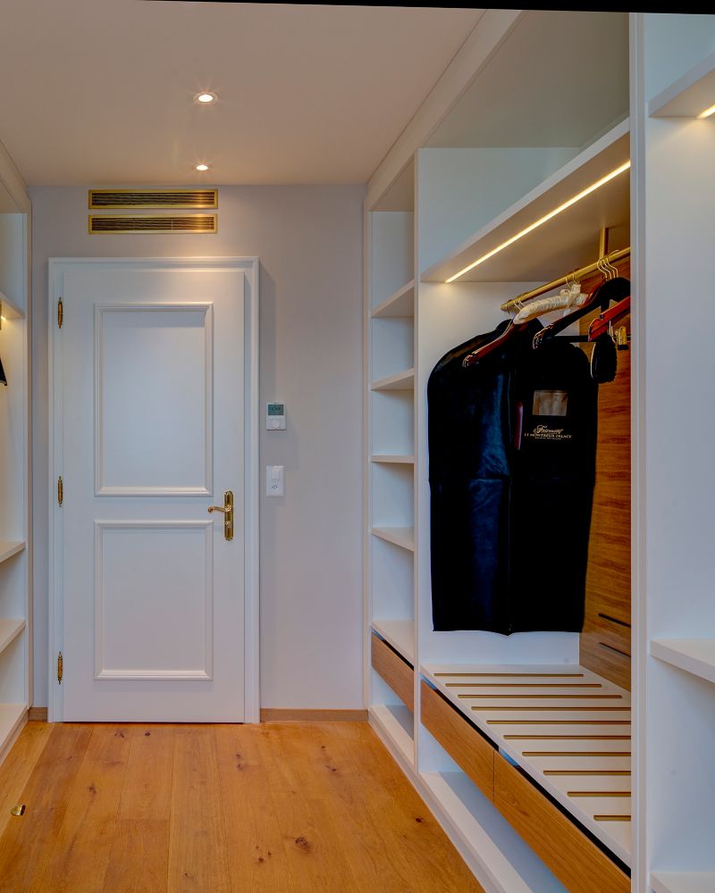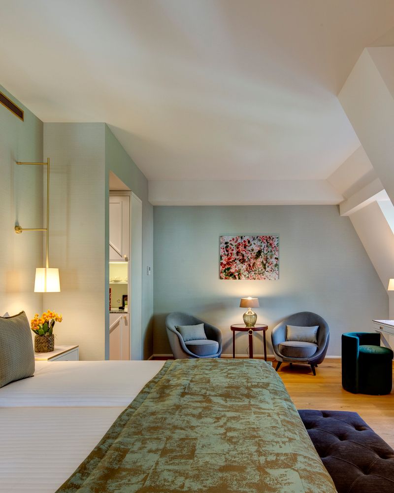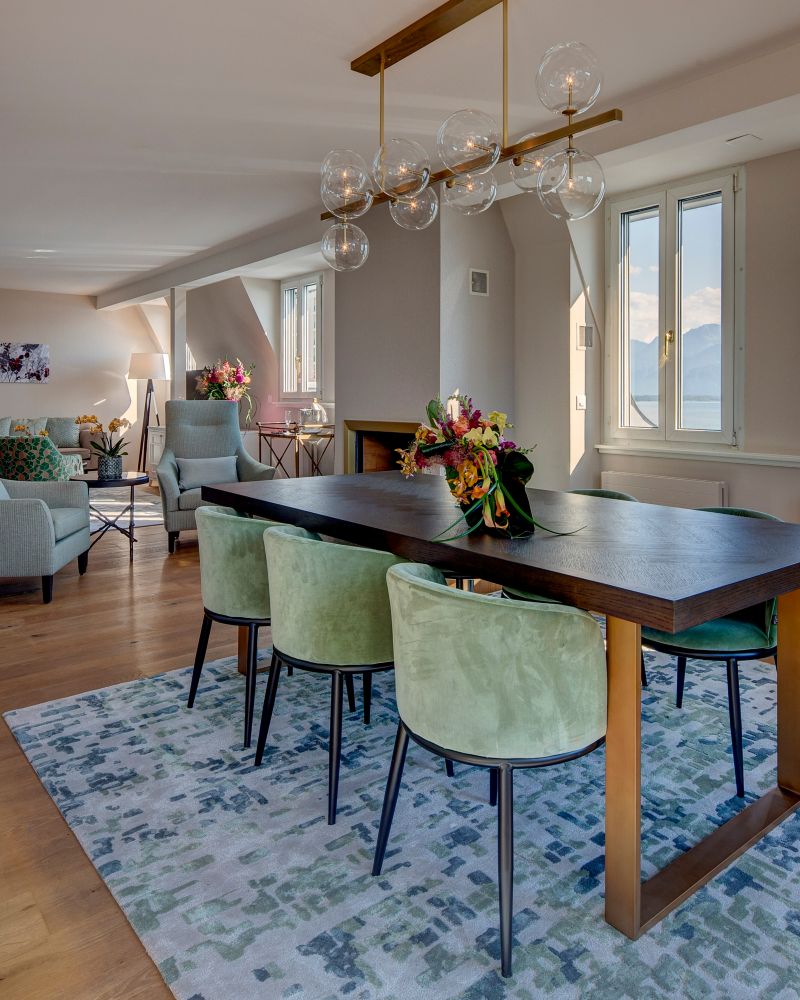 Située au 7e étage, la suite Penthouse offre 160 m² de luxe dans un décor chic et intemporel. Sublimée de matières nobles et de couleurs apaisantes, elle se compose d'une chambre spacieuse avec un dressing, d'un vaste salon avec une cheminée, d'un salon et d'une cuisine entièrement équipée. La terrasse offre une vue à 360° sur le lac Léman et les Alpes.