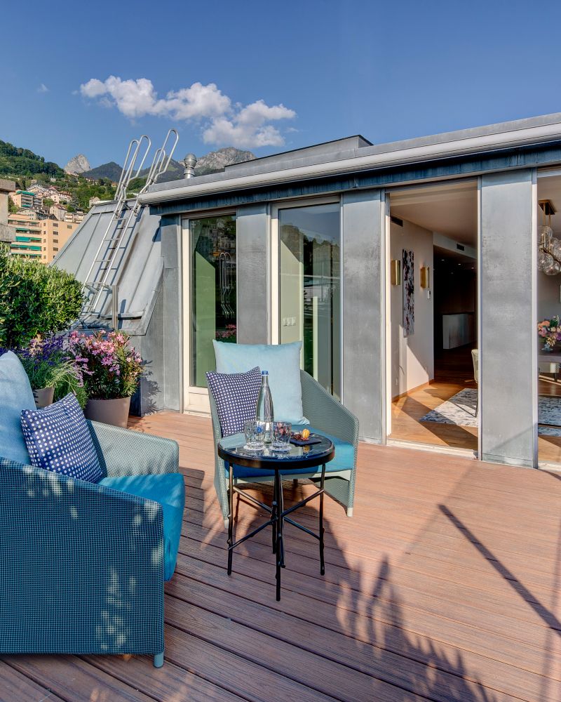 Notre suite Penthouse offre un luxe inégalé avec un ascenseur privé, une terrasse à 360° offrant la plus belle vue sur le lac Léman et les Alpes, et un vaste espace de vie pour un confort ultime.